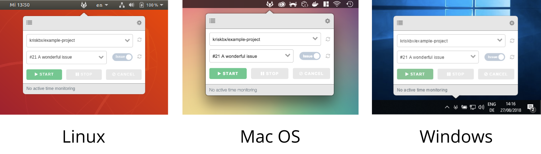 gtt taskbar is an open source crossplatform (Linux, Mac OS, Windows) menubar/taskbar application for GitLab's time tracking feature based on the gtt command line interface.