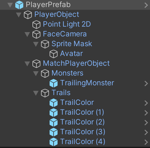 LMK this works. Run the game and press 1-5 to see the timeline animations. Note on these, edits to the hierarchy can break these types of animations. This is why there's a lot of organization in the prefab, to prevent breaks in the animation. All the timeline animations are stored on the parent PlayerPrefab but actually move the PlayerObject or FaceCamera objects, depending on whether the monsters and trails should follow.